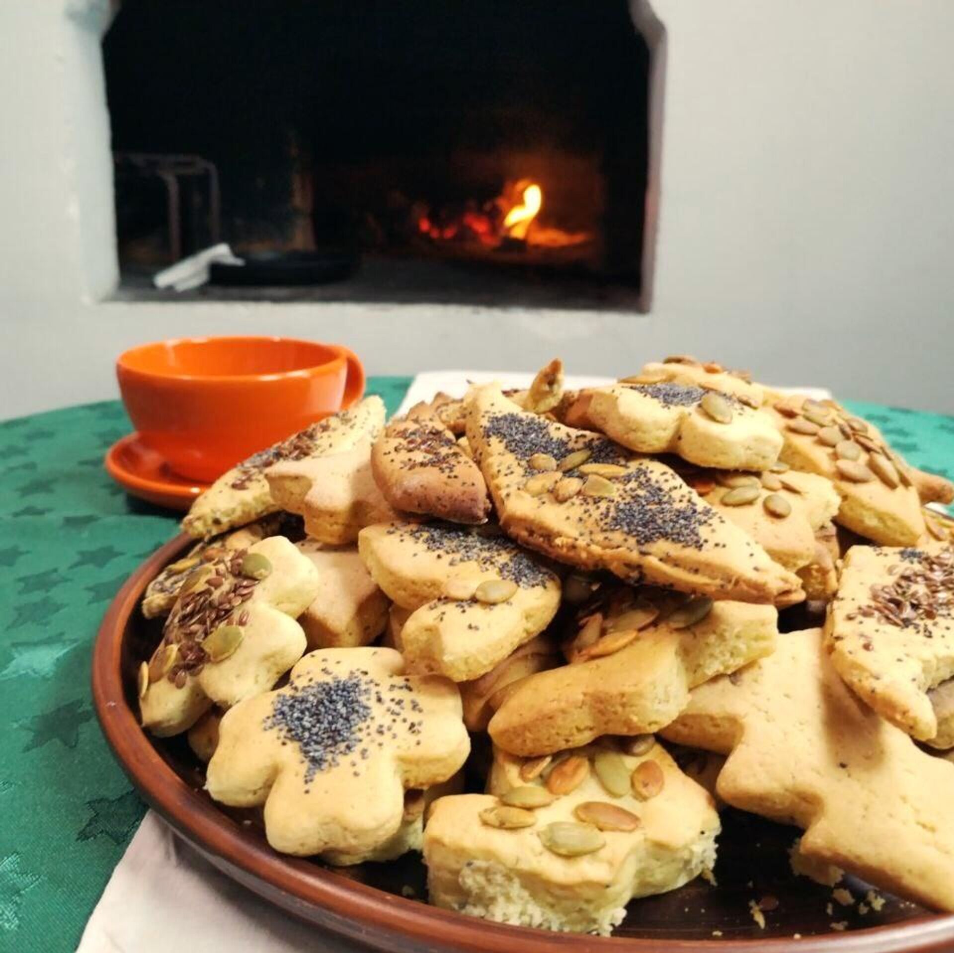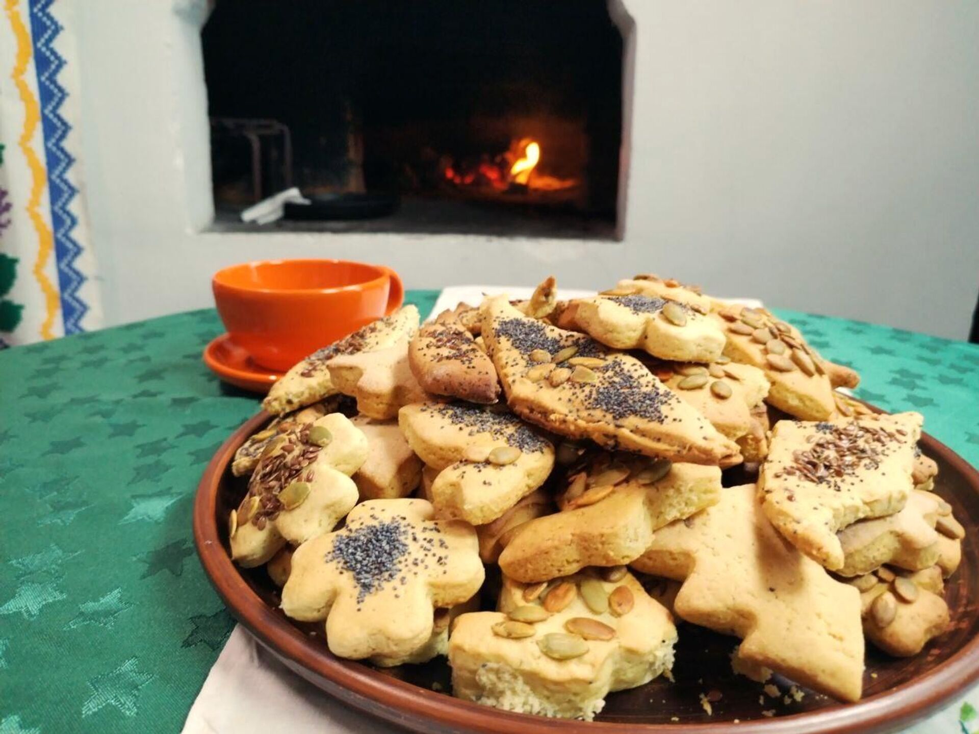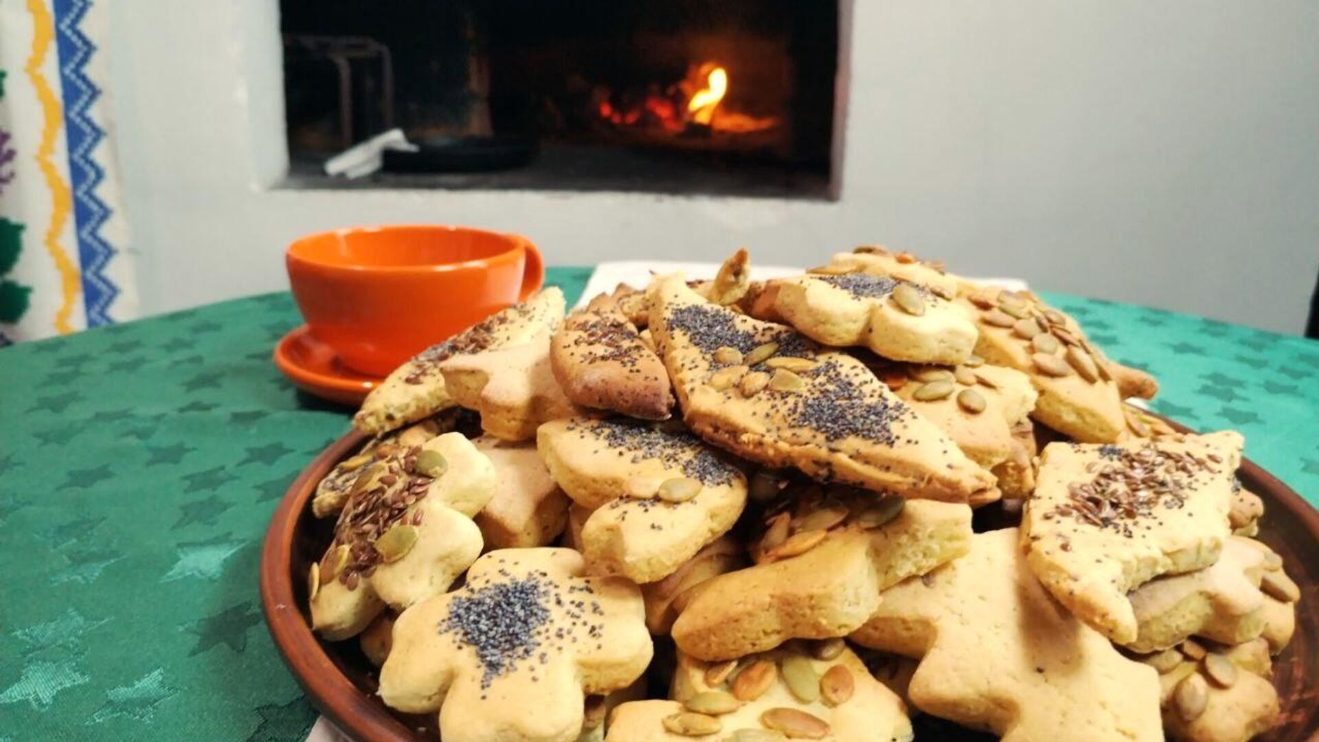 Пасля раскачаць цеста ў пласт 0,5 см і нарэзаць ромбікамі (можна выкарыстаць і адмысловыя формы). Змазаць зверху вадой і пасыпаць насеннем гарбуза, сланечніку, лёну і маку.