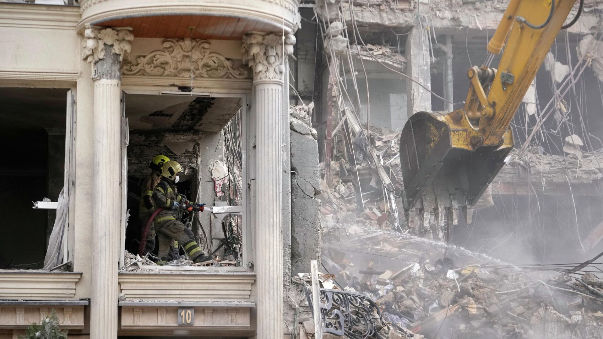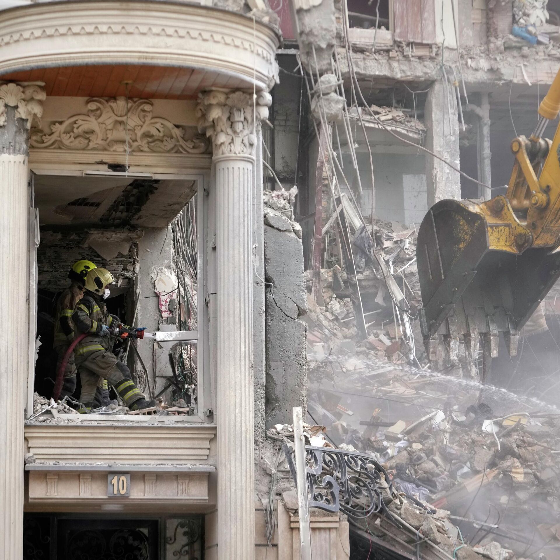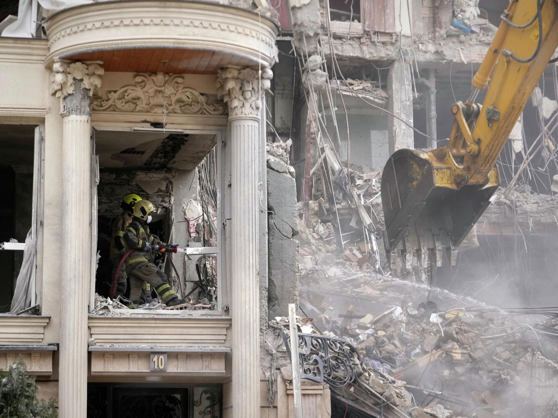 Пажарны палівае тлеючыя абломкі вадой, пакуль бульдозер расчышчае завалы жылога дома, які пацярпеў у выніку амерыкана-ізраільскага ўдару ў Тэгеране. - Sputnik Беларусь